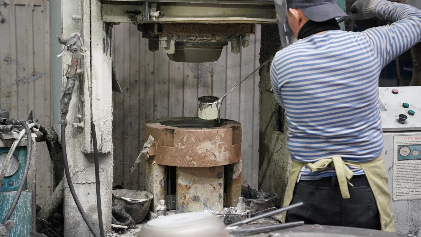 При кокильном литье алюминиевый сплав заливается в предварительно прогретую до 550°С специальную многоразовую форму (кокиль). В ней металл застывает и принимает форму будущего готового изделия.